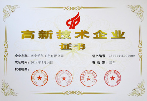 (本網(wǎng)訊) 熱烈慶祝集團(tuán)公司------千年工藝獲得了由廣西科技廳、廣西財(cái)政廳、廣西國(guó)稅局、廣西地稅局聯(lián)合頒發(fā)的“高新技術(shù)企業(yè)證書(shū)”,成為廣西2014年首批國(guó)家級(jí)高新技術(shù)企業(yè)之一。